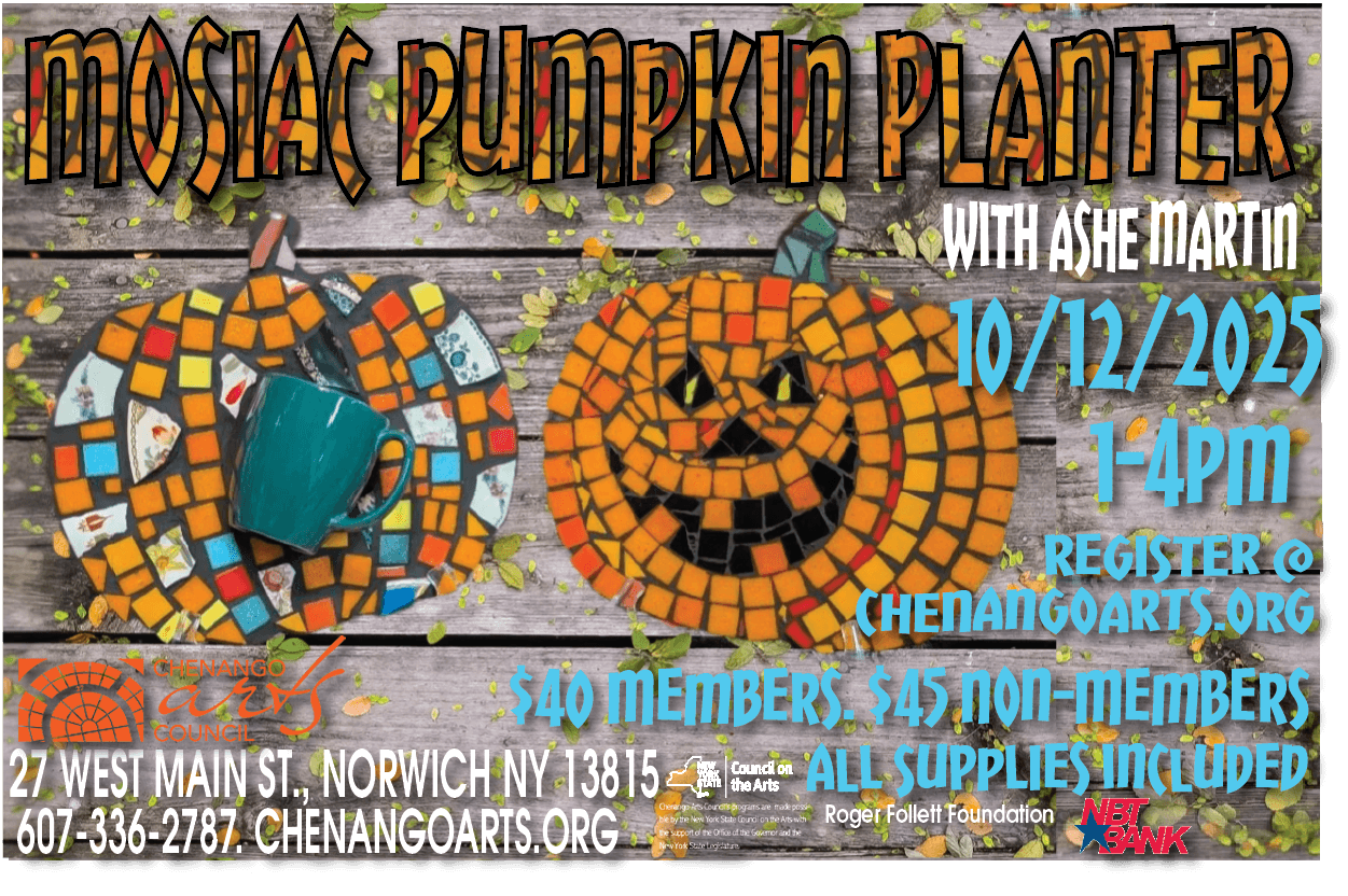 Join us for a creative experience where you can design your very own mosaic pumpkin planter! In this class, you will learn the techniques of mosaic art while creating a beautiful planter that can be used for your fall decorations or as a unique gift.