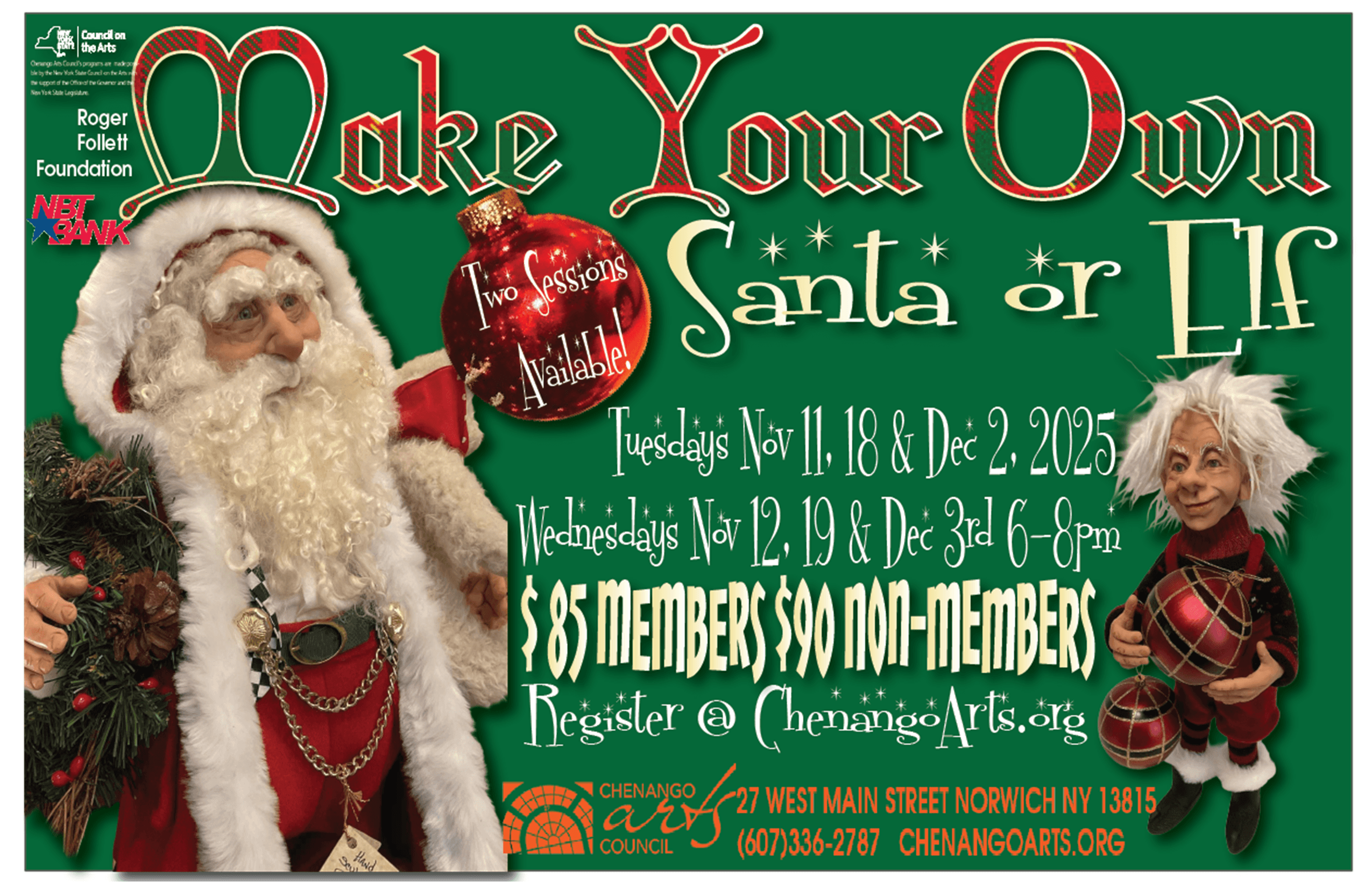 YOUR CHOICE create your own Santa or Elf just in time for the holidays! Linda Kays Biviano takes you step by step. All supplies included, but please bring your own scissors!