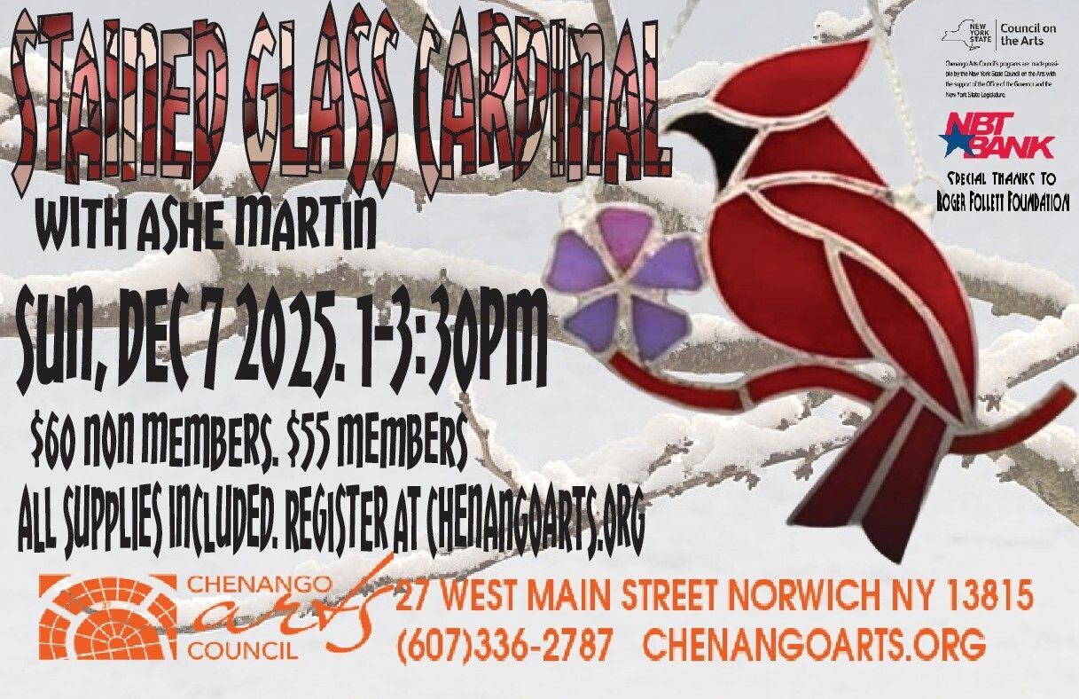 All supplies included. Ashe Martin teaches you to make your own stained glass cardinal ornament, just in time for the Holidays!!